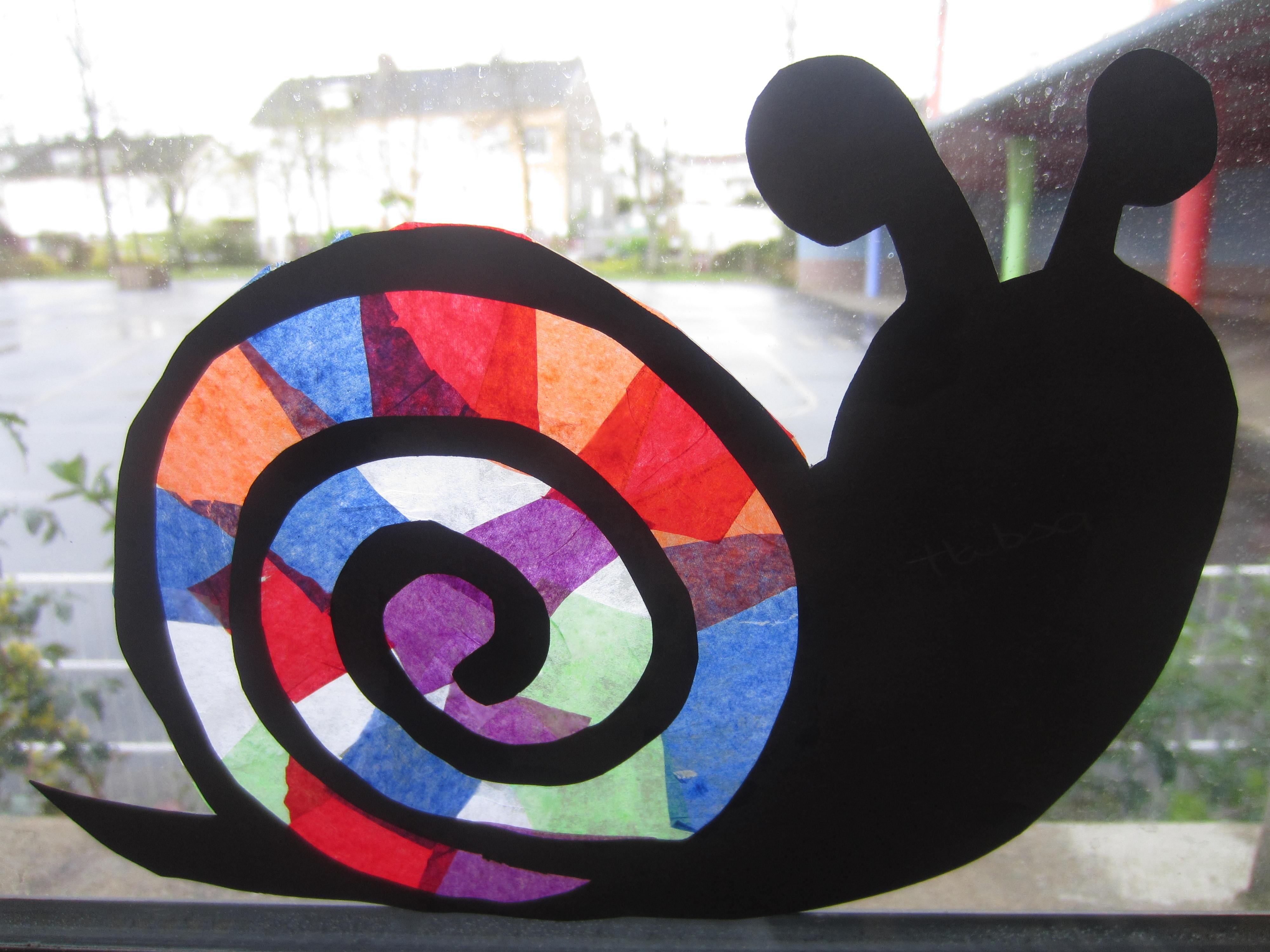 Je découpe des petits morceaux de papier dans des bandes colorées puis je les colle sur la spirale pour réaliser la coquille de l'escargot.