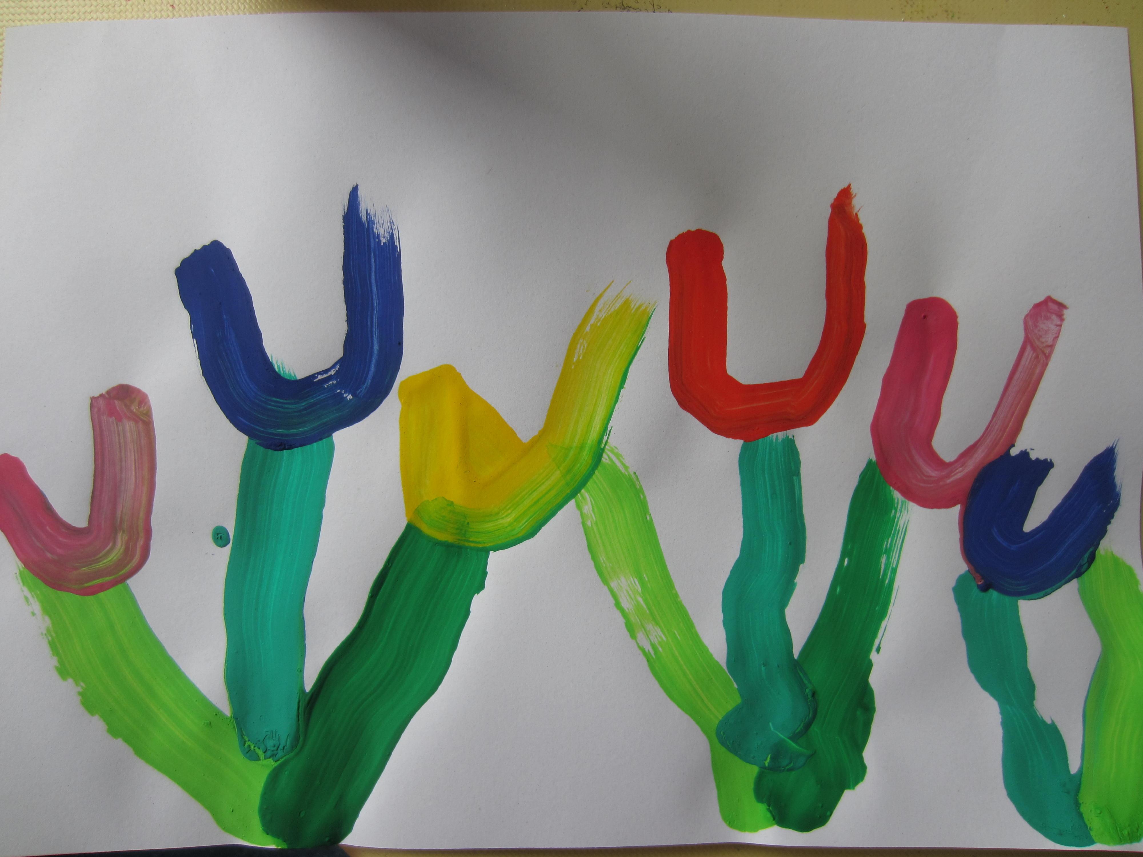 Je fais des traits pour réaliser des tiges avec un pinceau ensuite avec de la peinture, je réalise des fleurs en faisant des ponts à l'envers .