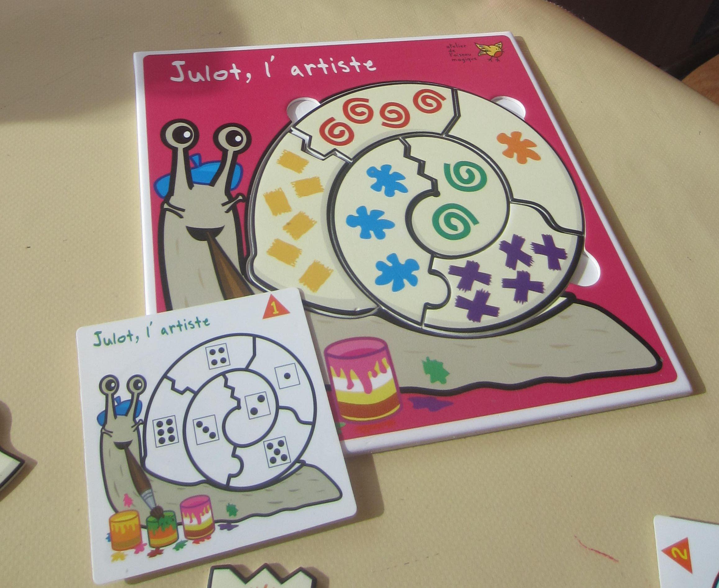 Je reconnais les quantités pour reconstituer l'escargot en reconnaissant ou en comptant les constellations, l'écriture chiffrée ou les couleurs ou terme à terme.